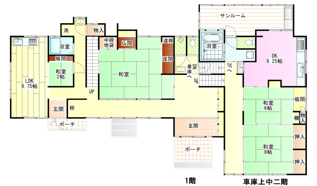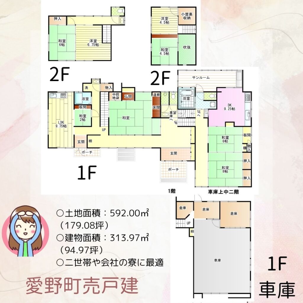 | 間取り | 8SLDK(和 12・8・6・6・4.5 洋 6.7・4.5・9.2 LDK 11 S 4.5・3) | 建物面積 | 313.97m² |