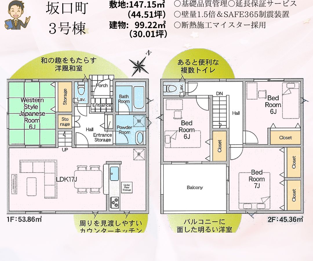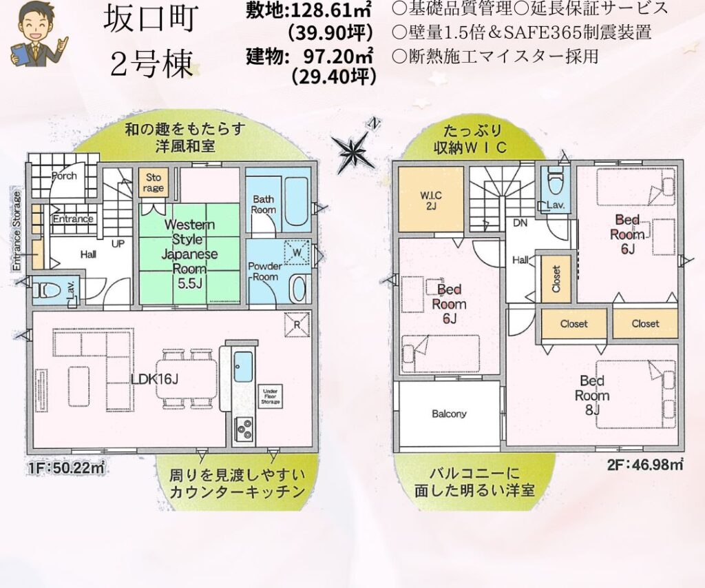 | 設備 | オートバス バス1坪以上 追焚機能 浴室暖房 浴室乾燥機 浴室に窓あり トイレ2ヶ所 温水洗浄便座 シャワー付洗面化粧台 3口以上コンロ IHクッキングヒーター カウンターキッチン システムキッチン グリル 浄水器 全居室収納 クローゼット ウォークインクローゼット 床下収納 省エネ給湯器 複層ガラス Low-Eガラス 電気 上水道 下水道 側溝 EV車充電設備 ダブルロックドア モニタ付インターホン ディンプルキー 防犯カメラ 火災警報器(報知機) 庭 駐車場3台分以上 | ||||