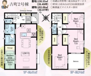 | 設備 | オートバス バス1坪以上 追焚機能 浴室暖房 浴室乾燥機 浴室に窓あり トイレ2ヶ所 温水洗浄便座 シャワー付洗面化粧台 3口以上コンロ IHクッキングヒーター カウンターキッチン システムキッチン グリル 浄水器 全居室収納 クローゼット 床下収納 人感センサー付照明 ダウンライト フットライト 省エネ給湯器 複層ガラス Low-Eガラス 電気 上水道 下水道 側溝 EV車充電設備 ダブルロックドア モニタ付インターホン ディンプルキー 防犯カメラ 火災警報器(報知機) ワイドバルコニー ルーフバルコニー 駐車場3台分以上 | ||||
